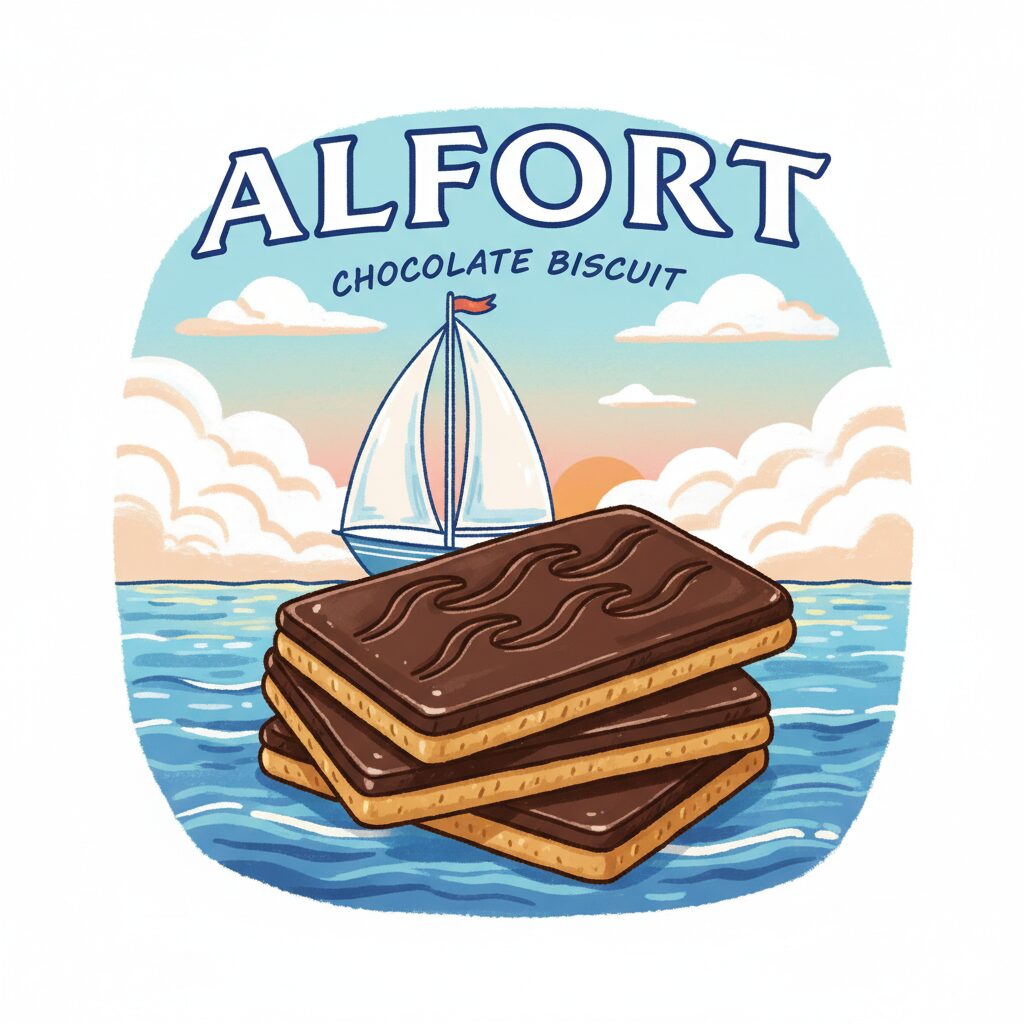 チョコの表面に刻まれた帆船のデザイン。アルフォートとはフランス語で「帆走する」を意味します。このビジュアルが棚での視認性を高め、「あ、あの船のやつ」という想起につながります。